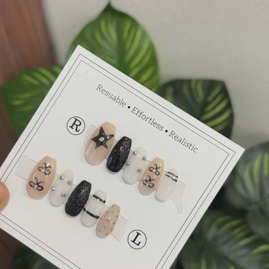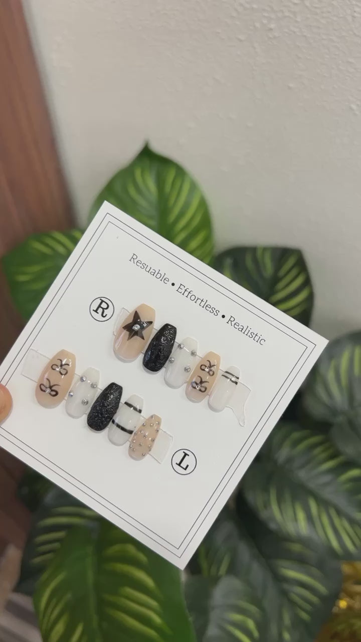 The kit includesĀ set of 10 customized gel based presson nails, liquid glue, gel tabs, buffer, cuticle pusher, alcohol wipe and the instruction card š§”